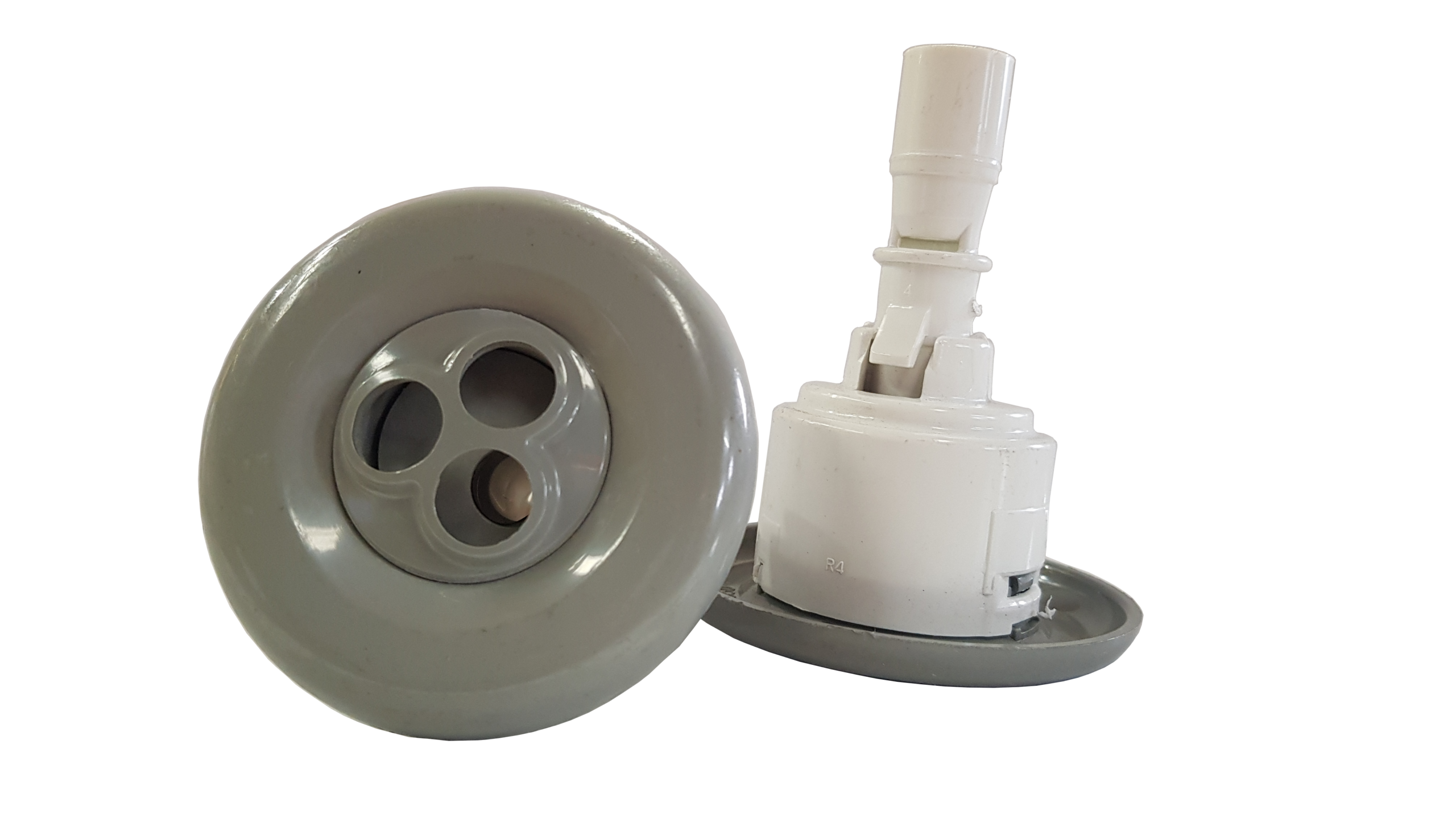 Grey smooth face with rotating nozzle and 3 hole face.